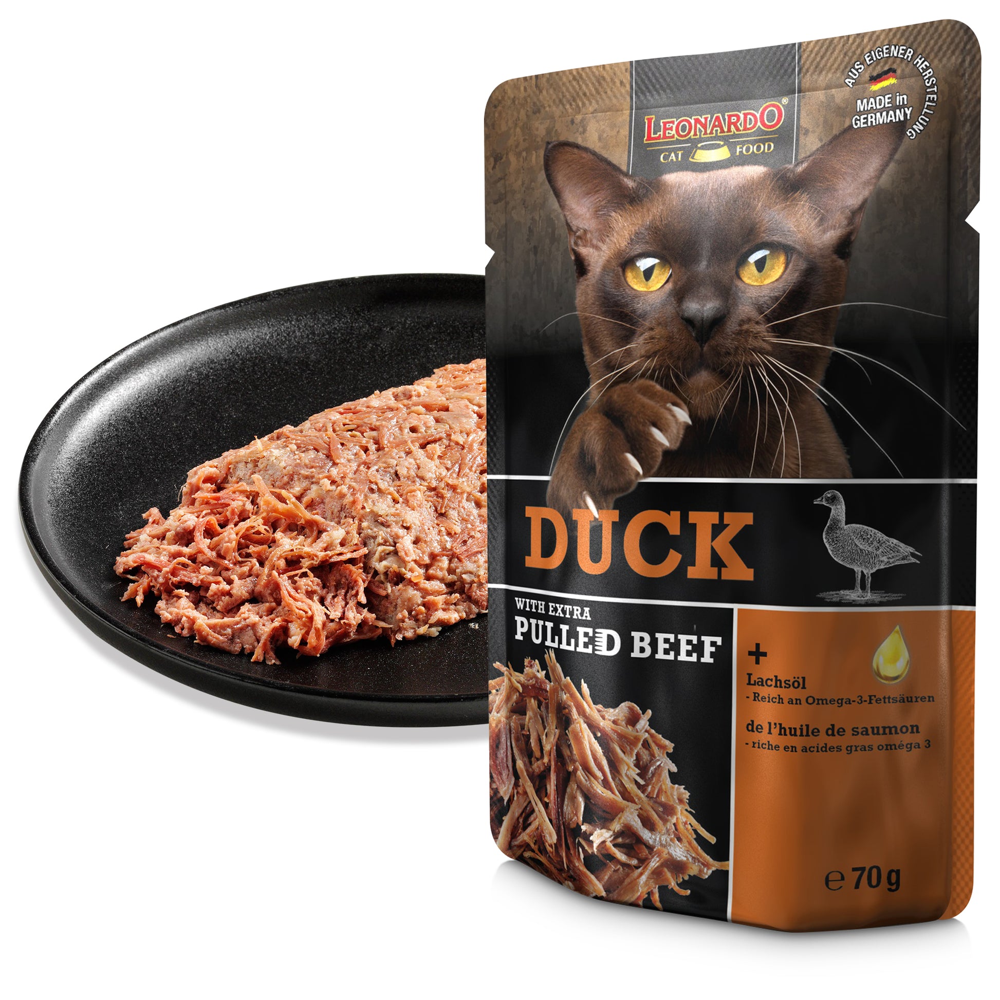 Carne, corazón, hígado y mollejas de pato (34,5 %); caldo de carne (34,3 %); ternera desmenuzada (14 %); hígado de pollo (8,5 %); pulmón de ternera (7,5 %); cáscaras de huevo*¹ (0,5 %); minerales (0,5 %); aceite de salmón (0,2 %)