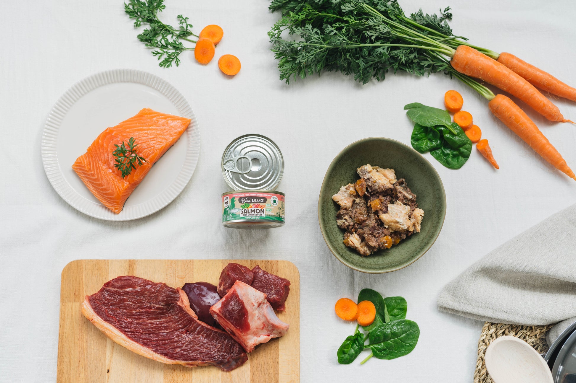 50% Ternera (25% carne picada de ternera, 8% corazón de ternera, 7% hueso con tuétano de ternera, 5% hígado de ternera, 5% riñón de ternera), 45% Salmón , 3% Zanahoria y 2% Espinaca.